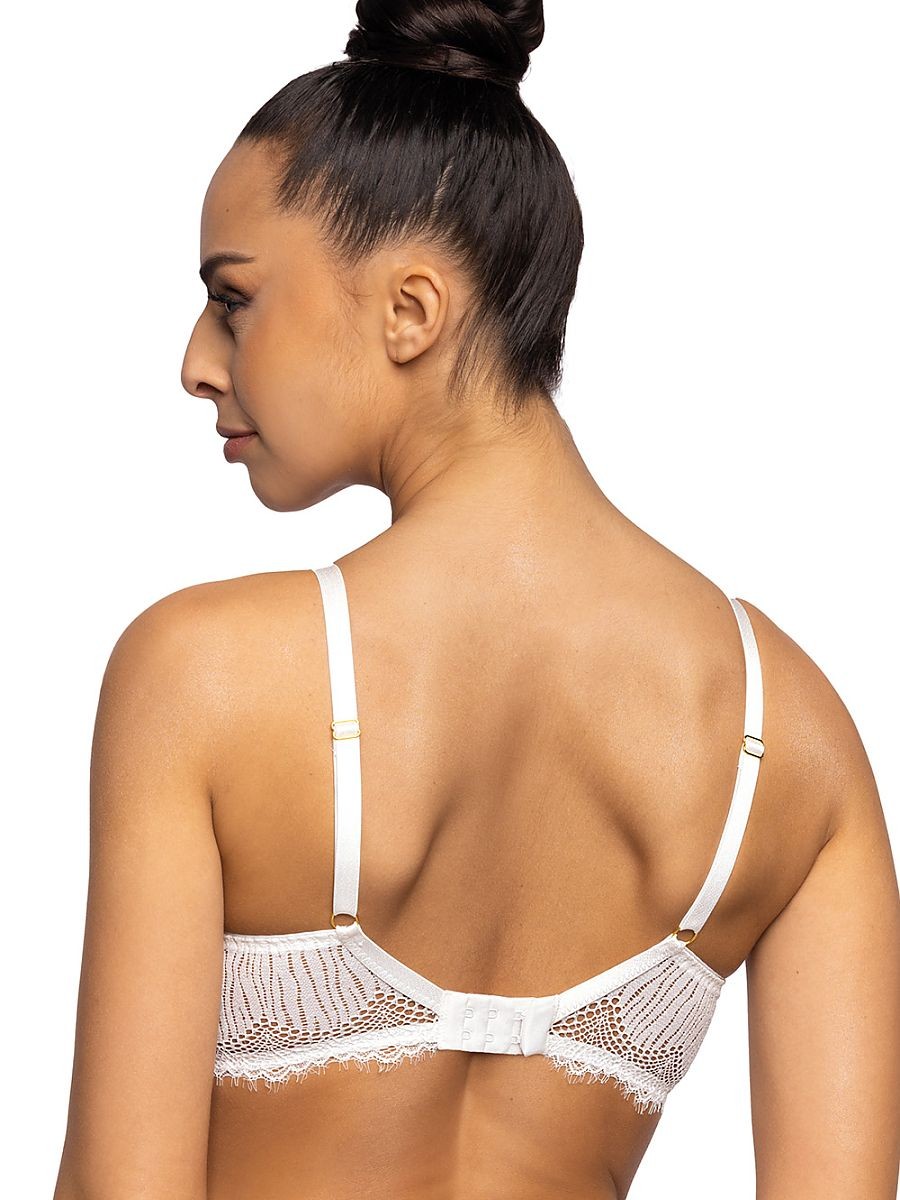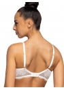 Liza est un modèle extrêmement délicat et séduisant avec des bonnets push-up. Le modèle est fait de tissus de la plus haute qualité de couleur crème. Une charmante dentelle recouvre la partie inférieure du bonnet, tandis que le haut est fait de résille qui monte le long de la bretelle. Le centre et les côtés sont faits de dentelle à motifs. Un petit accent bijoux au centre. Bretelles non amovibles, réglables. Coussinets push-up amovibles. Fermeture à deux rangées avec réglage sur trois niveaux.