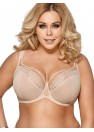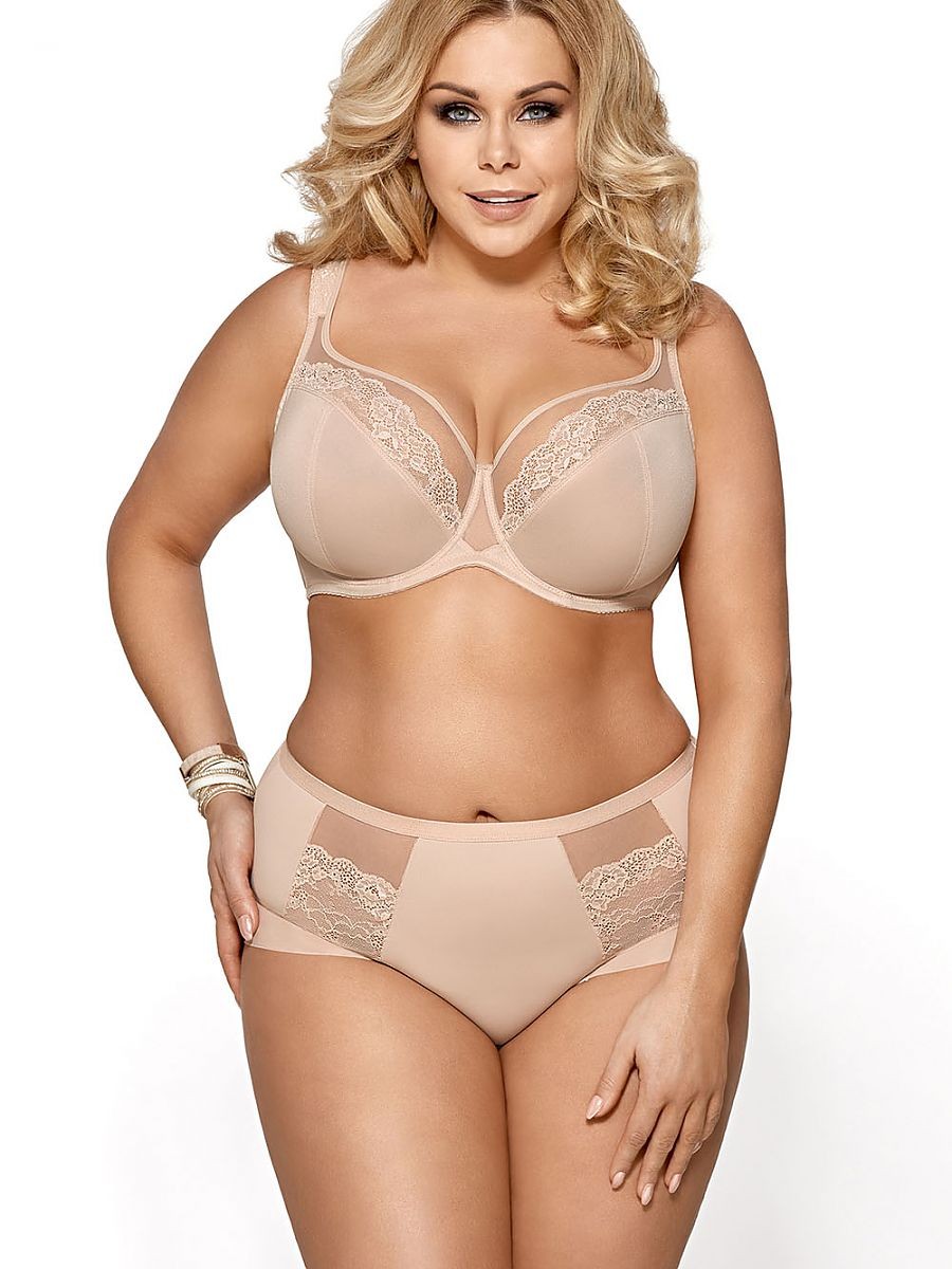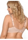 Soutien-gorge féminin souple de couleur beige. Les bonnets recueillent bien la poitrine et la maintiennent en place, exposant joliment le décolleté. Parties inférieures des bonnets en tissu tricoté stable et mat. La partie supérieure est faite de tulle transparent avec une belle dentelle cousue. Le pont est fait de tissu tricoté lisse et de tulle. Les bonnets sont formés avec un fil de fer autour des seins. L'ensemble fait que les seins sont parfaitement ramassés vers l'intérieur, relevés et conservent une belle forme arrondie. Les côtés larges en tricot Lycra résistant, équipés en plus d'une armature verticale assurent que le soutien-gorge reste en place. Un grand avantage de ce soutien-gorge sont les bretelles cousues et étendues qui assurent le confort du port. Les bretelles sont réglables, non amovibles, de largeur différente selon la taille. Fixation : crochets à 3 échelons, à deux ou trois rangs, selon la taille.