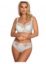 Un soutien-gorge semi-coussiné, sans armature latérale, fabriqué selon la nouvelle construction K16. La partie raidie du bonnet arrive au-dessus de la ligne du mamelon. Il s'agit d'un bonnet thermoformé. Soutien-gorge sans couture sur la cuvette, sur la partie supérieure de la cuvette il y a une belle broderie, la circonférence du soutien-gorge est faite de tulle. Il y a de subtils nœuds sur les bretelles, une décoration en forme de bijou au milieu entre les bonnets, les bretelles ne sont pas amovibles.