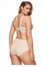 Soutien-gorge classique en tissu tricoté et tulle. Une décoration coquette est placée entre les tasses. Bonnets en trois parties, la partie inférieure des bonnets étant constituée d'une fine mousse de corset recouverte d'un tissu tricoté lisse, la partie supérieure étant entièrement constituée de tulle élastique. La partie intérieure des bonnets est rembourrée de coton. Le dos du soutien-gorge est en tulle. Bretelles réglables et non amovibles. Baleines latérales verticales pour éviter les plis latéraux.