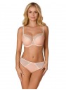 Élégant soutien-gorge semi-doublonné. La partie supérieure du bonnet est en maille, la partie inférieure du bonnet est en tricot à motifs de couleur pêche. Pont en maille, nœud décoratif entre les bonnets. Bretelles réglables, non amovibles. Dos en maille élastique, fermeture auto-agrippante.