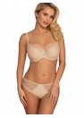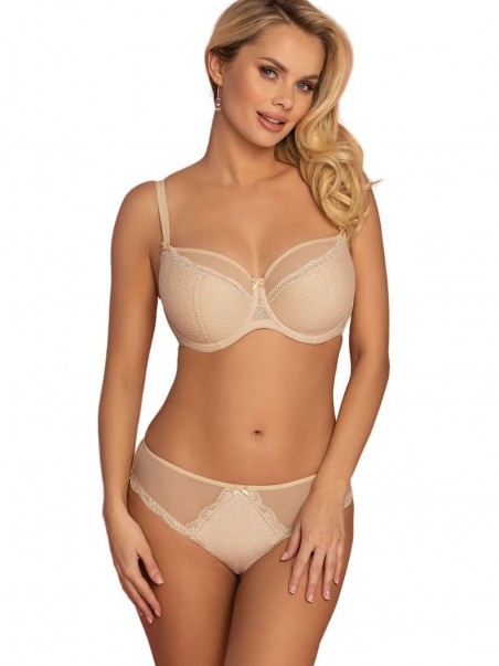 Élégant soutien-gorge semi-dosé. La partie supérieure des bonnets est en maille, la partie inférieure des bonnets et le pont sont en dentelle. Un nœud entre les bonnets, des baleines latérales verticales, des bretelles réglables et inamovibles. Dos en maille lisse, fermeture auto-agrippante.
