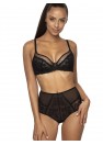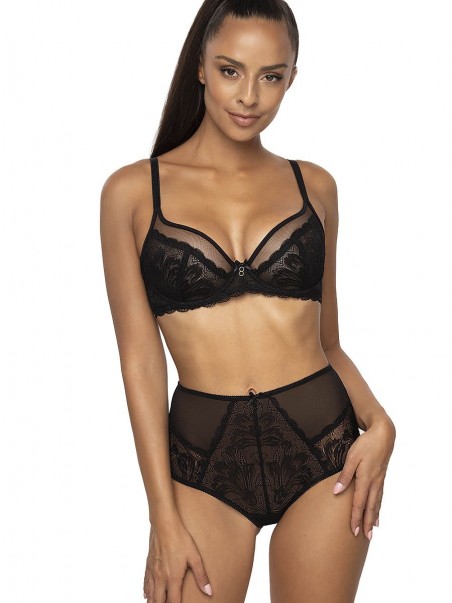 Soutien-gorge souple noir pour femme. La partie supérieure du bonnet est en maille, la partie inférieure du bonnet et l'entre-bonnet sont en dentelle. Un nœud entre les bonnets avec une breloque décorative, baleines verticales sur les côtés. Bretelles réglables non amovibles. Dos en maille, fermoir à crochets à l'arrière. Fermoir à deux rangées avec réglage en trois étapes.