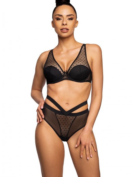 Dotssy, soutien-gorge extrêmement sexy avec bonnets push-up. Modèle en noir, fabriqué dans des tissus de la plus haute qualité. Bonnets allongés entièrement en tulle stable avec de charmants points. Côtés en maille élastique. Petit nœud au centre avec une touche de bijou. Bretelles réglables. Coussinets push-up amovibles. Fermeture à deux rangées de crochets et d'œillets avec réglage en trois étapes.