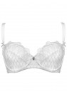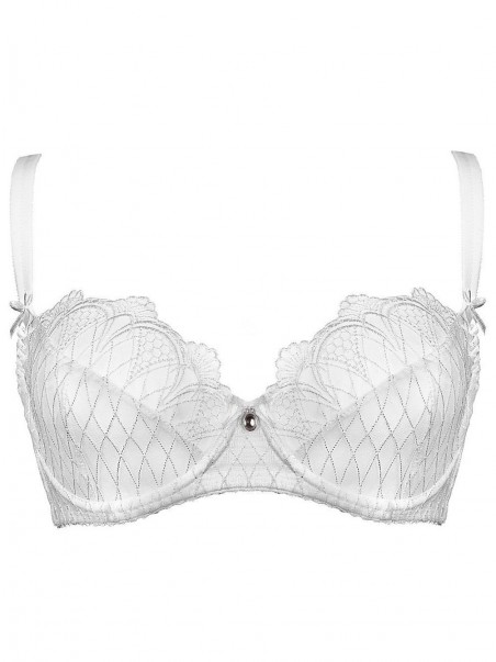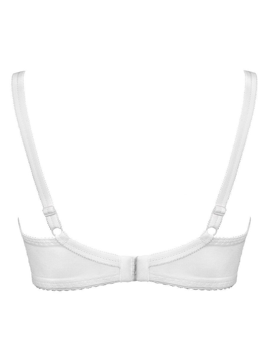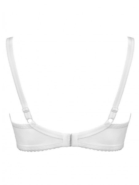 Lingerie séduisante avec bonnets souples en blanc classique. Le modèle fronce et modèle parfaitement la poitrine. Les bonnets sont décorés d'une broderie subtile, la partie inférieure est renforcée par une maille élastique. Le dos en maille Lycra, renforcé par des baleines verticales, maintient parfaitement la poitrine, même volumineuse. Bustier, bretelles réglables. Décoration bijou entre les bonnets. Fermeture à deux rangées de crochets et d'œillets avec réglage en trois étapes.