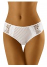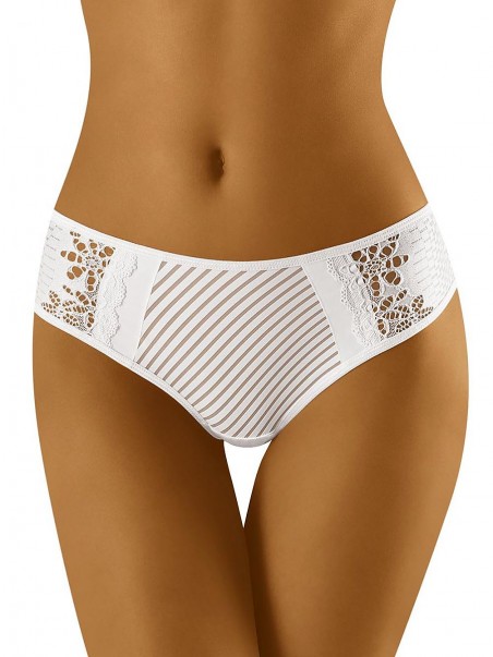 Délicat string en tricot avec des côtes élégantes. Jolie bordure en dentelle sur le dessus.