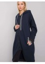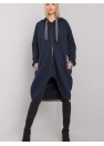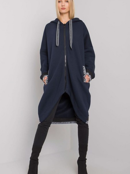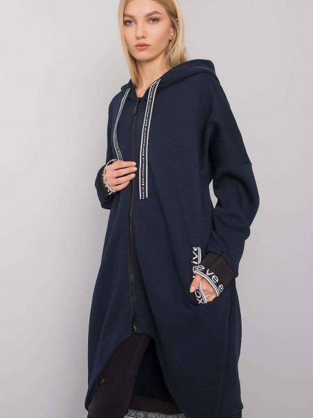 Sweat-shirt à fermeture éclair étendue bleu marine pour femme. Le sweat-shirt a une capuche et des poches coulissantes.