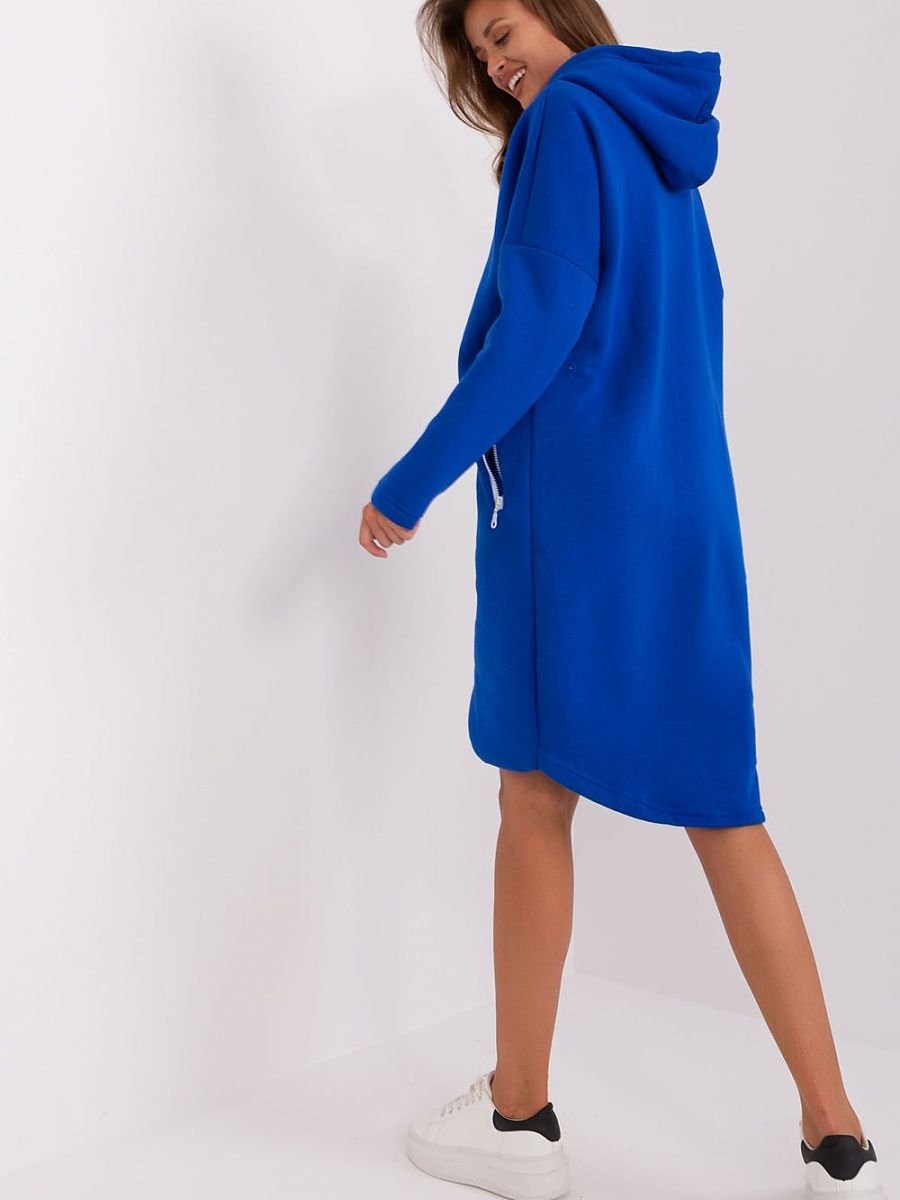 Sweat-shirt pour femmes avec une coupe allongée, des manches longues et une capuche. Le sweatshirt se ferme par une fermeture à glissière, avec des poches sur les côtés également fermées par des fermetures à glissière.