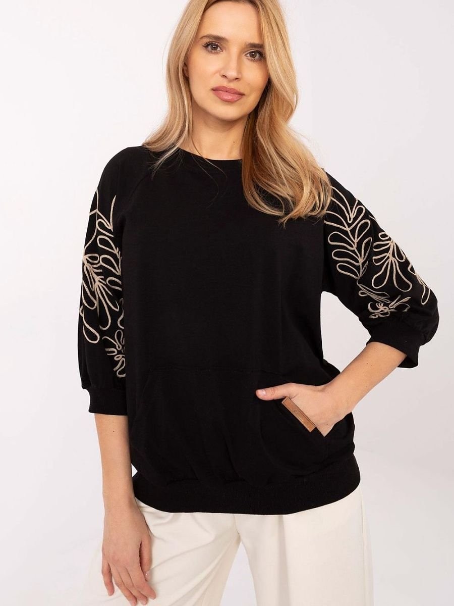 Sweatshirt casual pour femme à enfiler par la tête, idéal pour tous les jours et pour le travail. Fabriqué en coton doux avec ajout d'élasthanne, il assure un confort de port et une liberté de mouvement. Modèle de longueur standard avec manches 3/4, c'est un choix parfait pour toutes les saisons. La poche pratique de type kangourou avec un patch décoratif ajoute un caractère sportif au sweat-shirt. Un autre atout sont les motifs brodés de branches et de feuilles sur les manches, qui ajoutent une élégance subtile à l'ensemble. S'accorde parfaitement aussi bien avec un jean qu'avec un pantalon en tissu, créant un ensemble élégant et confortable.