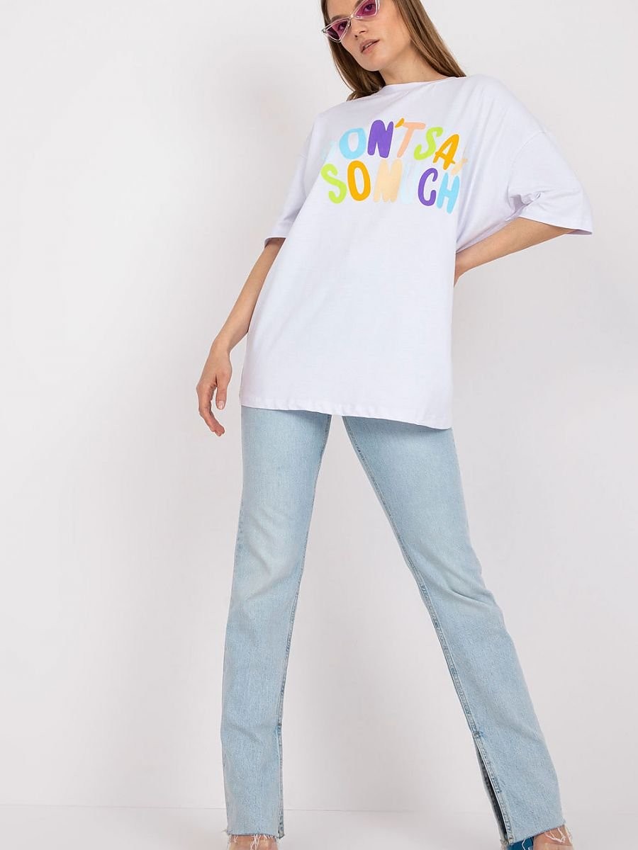 T-shirt ample à manches courtes pour femme. Inscription décorative sur le devant.