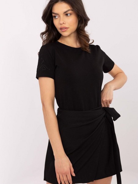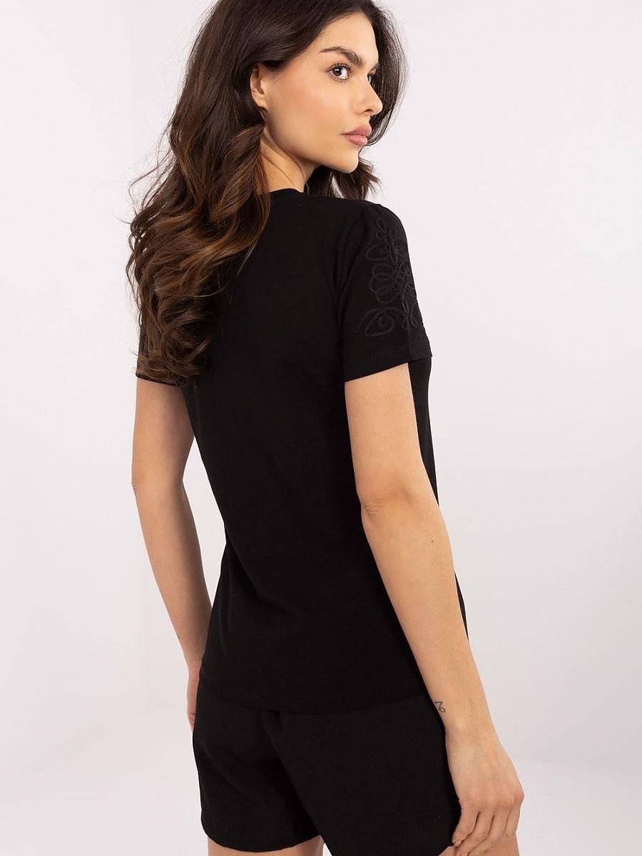 T-shirt pour femme dans un style décontracté, idéal pour tous les jours. Fabriqué dans un mélange doux de coton et d'élasthanne, il offre confort et élasticité, s'adaptant à la silhouette. Le tissu lisse souligne la simplicité et la polyvalence du modèle. Les manches courtes et l'encolure ronde créent une coupe classique qui convient à de nombreuses tenues. La broderie décorative sur les manches ajoute un accent subtil mais original à la blouse, lui conférant un caractère exceptionnel. Un choix idéal pour les tenues décontractées et quotidiennes.