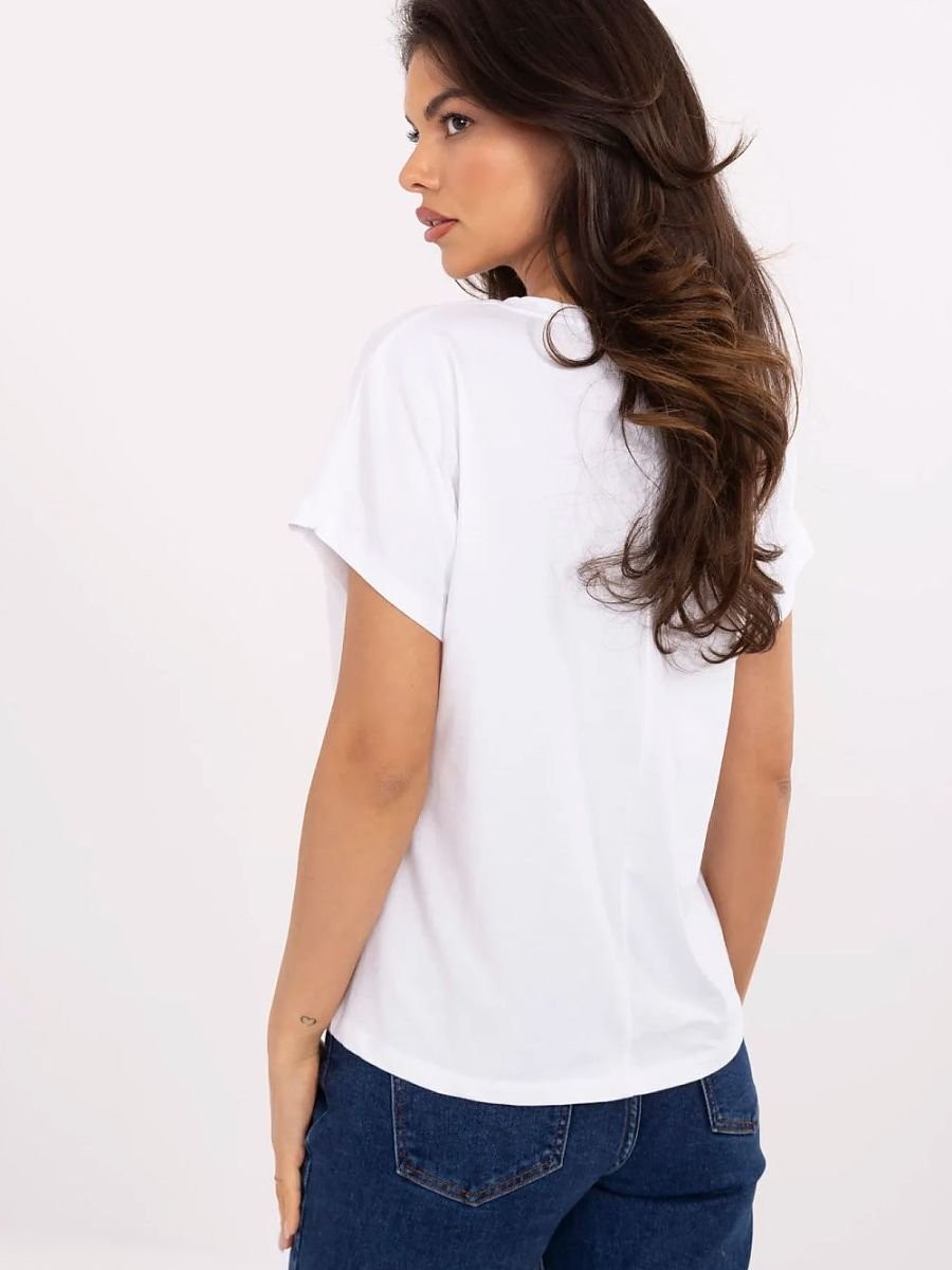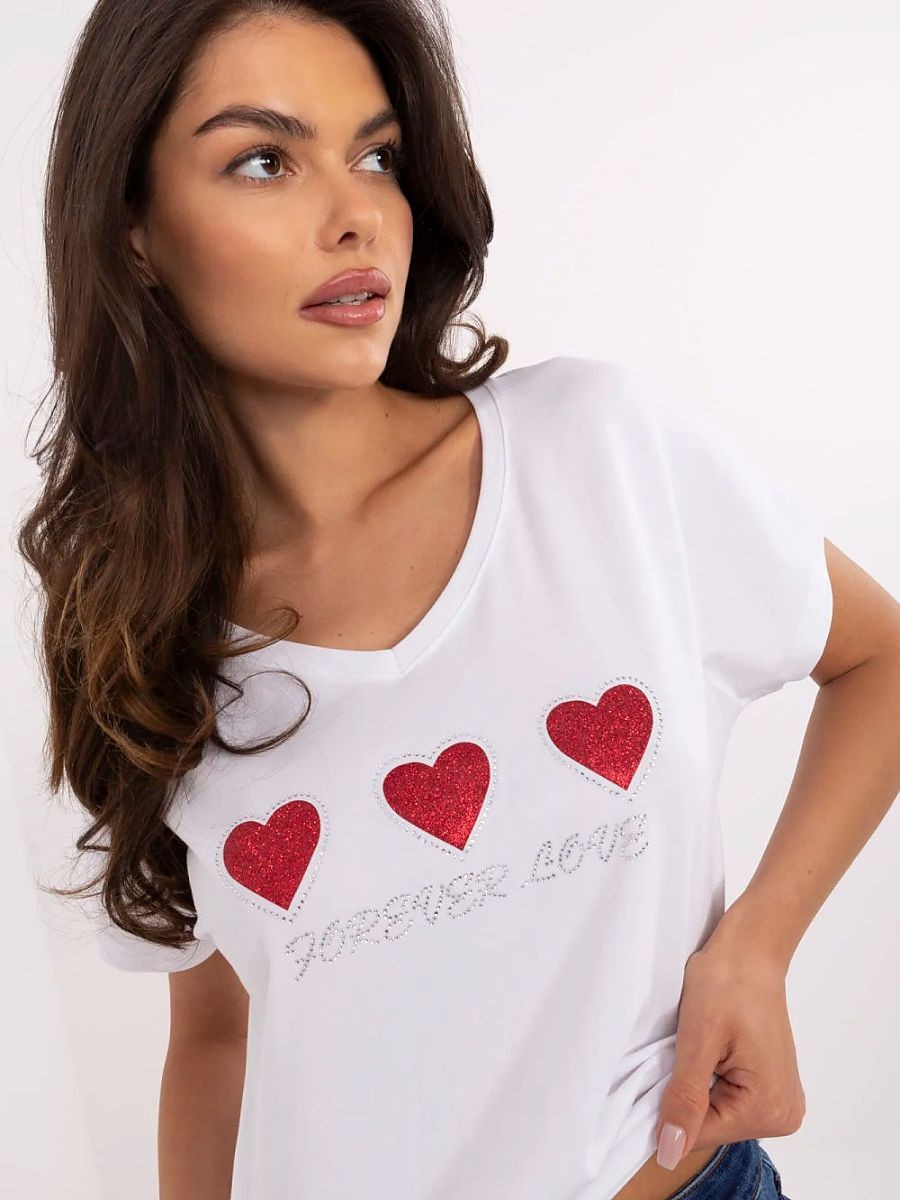 Le t-shirt casual pour femme est une proposition confortable et élégante pour les sorties quotidiennes. Fabriqué en coton doux avec une touche d'élasthanne, il offre confort et liberté de mouvement toute la journée. Modèle de longueur standard, avec des manches courtes et un col rond classique. Sur le devant, il y a une application décorative en forme de cœurs, entourée de strass brillants, qui ajoutent du charme et de l'éclat à la blouse. C'est l'option idéale pour les femmes qui apprécient le confort avec une touche de style romantique.