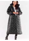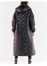 Manteau long et matelassé avec capuche. Il présente un ourlet évasé, des poignets côtelés et une fermeture par boutons-pression. Le manteau est fendu à partir des genoux, ce qui ne limite pas les mouvements, même pour les personnes les plus occupées. Entièrement doublé. Peut être utilisé comme un mackintosh.